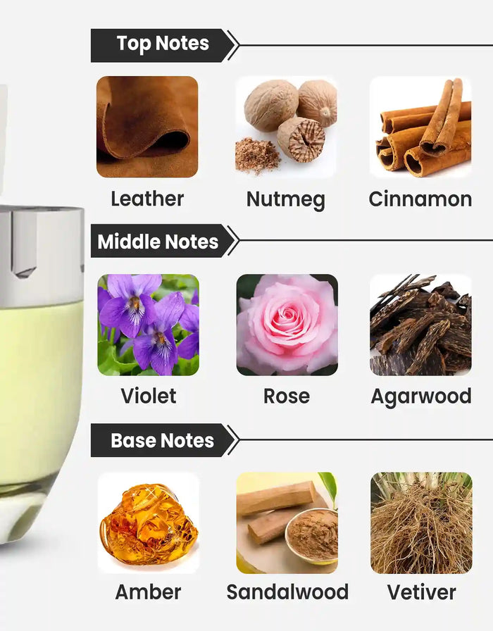 Top Notes: Leather, Violet Leaf, Nutmeg, Cinnamon