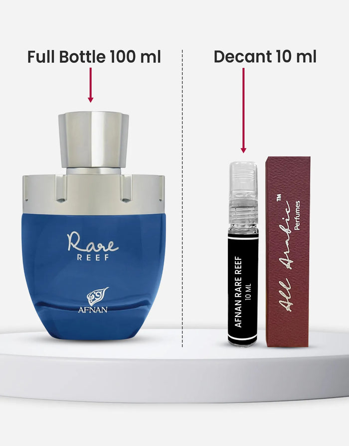 The Afnan Rare Reef Extrait De Parfum 10ML decant is a practical way to experience this fresh and fruity fragrance in a smaller size. It opens with orange, citron, grapefruit, mint, and blackcurrant, giving a bright and clean feel that suits daily wear. Coriander adds a mild spicy touch, while apricot, violet leaf, basil, and rose appear as the scent settles, creating a mix of fruit and green notes. The base of fig, dates, amberwood, and ambrette stays close to the skin and provides a warm finish that lasts for hours. This decant is ideal for workdays, warm climates, or keeping in your bag when you want a reliable scent without carrying a full bottle.