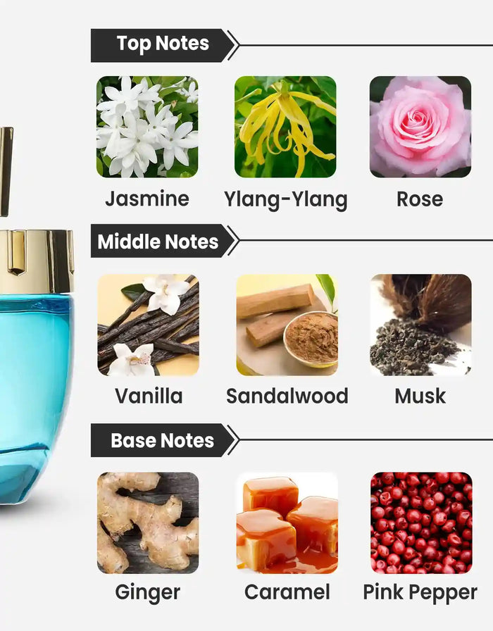 Top Notes: Ylang-Ylang, Jasmine, Rose