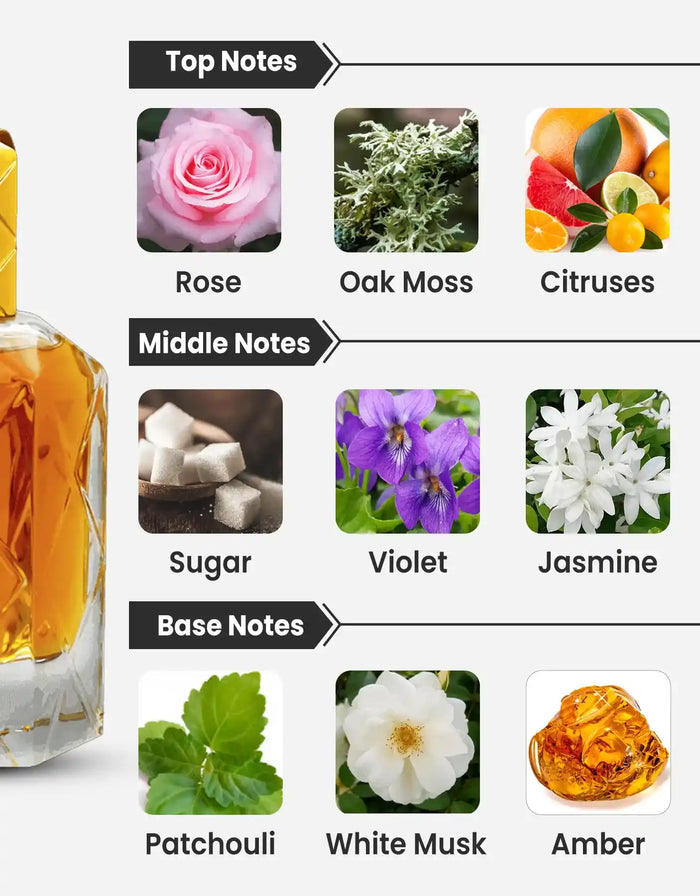 Top Notes: Saffron, Rose, Oak Moss, Citruses, Lavender