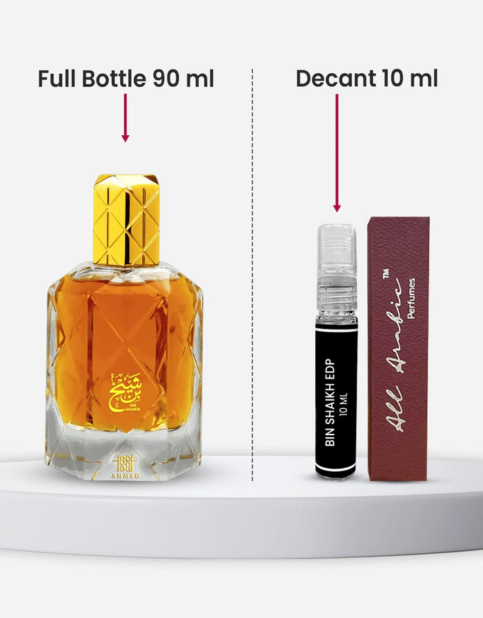 The Ahmed Al Maghribi Bin Shaikh 10ML decant brings the essence of the full 90ML bottle into a handy size, making it perfect for daily use or travel. The fragrance opens with a touch of saffron, rose, oak moss, citrus, and lavender, creating a balanced start that is both fresh and warm. As it develops, at the heart you’ll get sugar, bakhoor, jasmine, orchid, and violet, offering a sweet and floral character that feels rich. In the dry down, oud, amber, white musk, ambroxan, and patchouli combine to give the fragrance a lasting woody and musky finish. This decant makes it easy to carry a premium Arabic fragrance wherever you go.