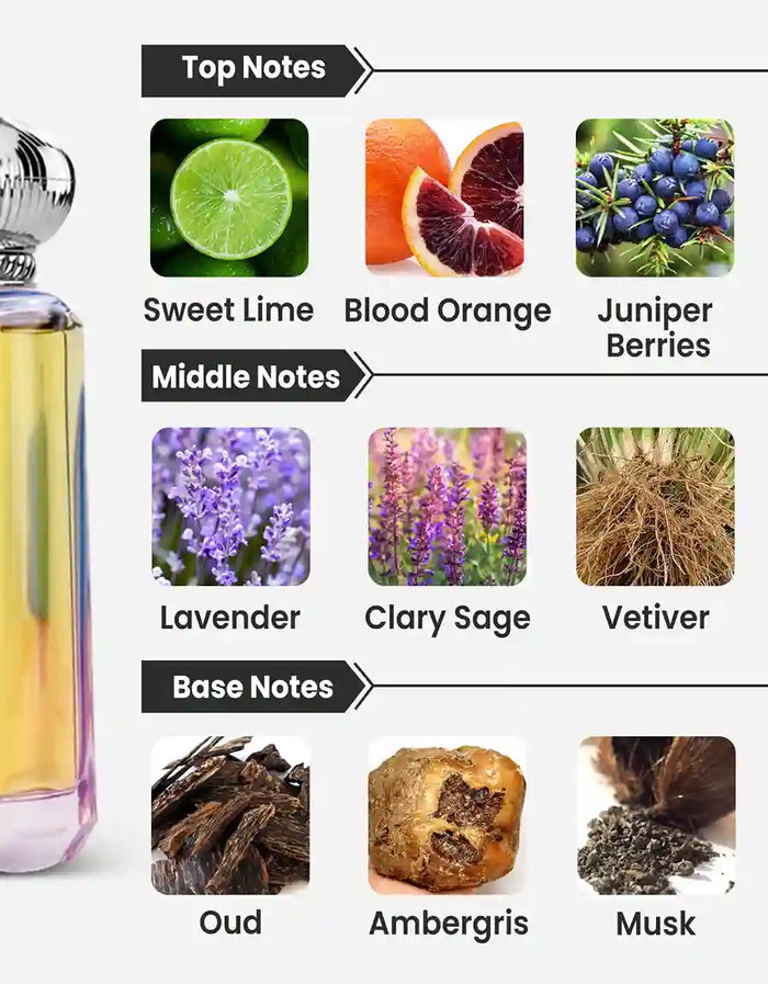 Base Notes: Oud, Ambergris, Ambroxan, Musk, Cedarwood, patchouli