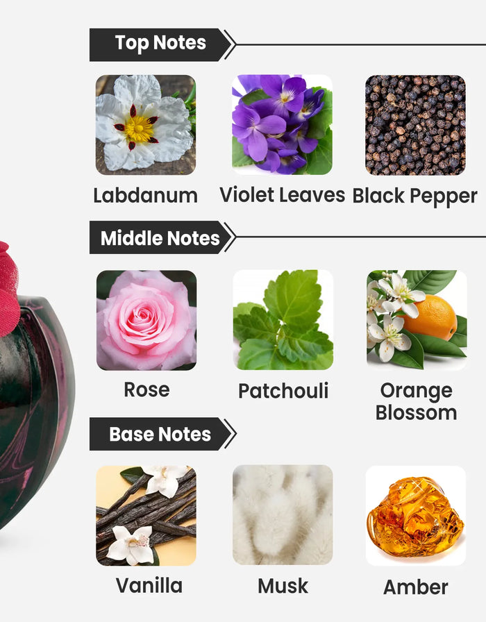 Middle Notes: Rose, Patchouli, Orange Blossom