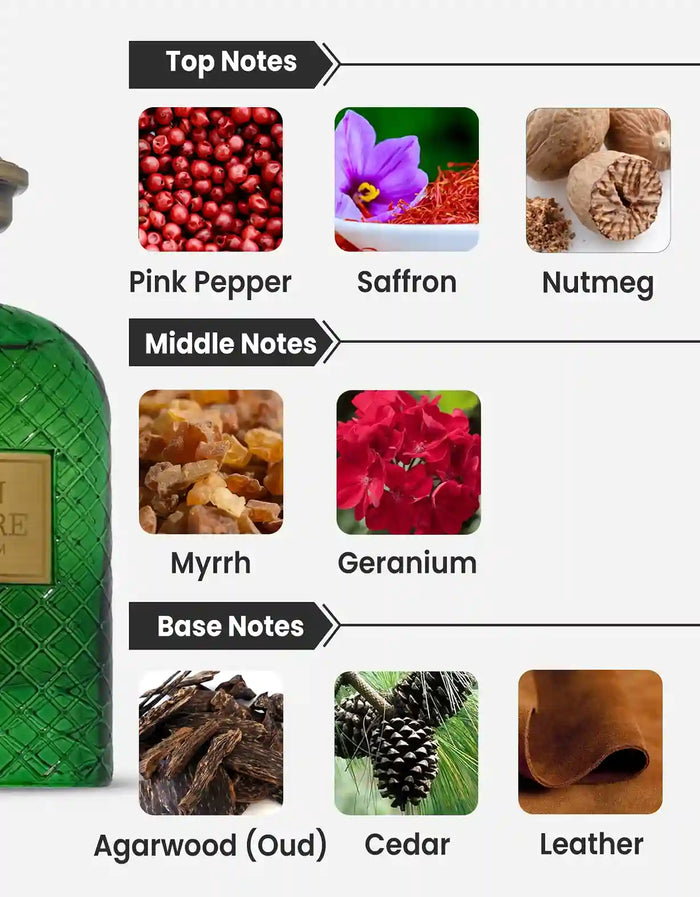 Top Notes: Pink Pepper, Olibanum, Saffron, Nutmeg, Cardamom, Caraway, Myrtle, Mace