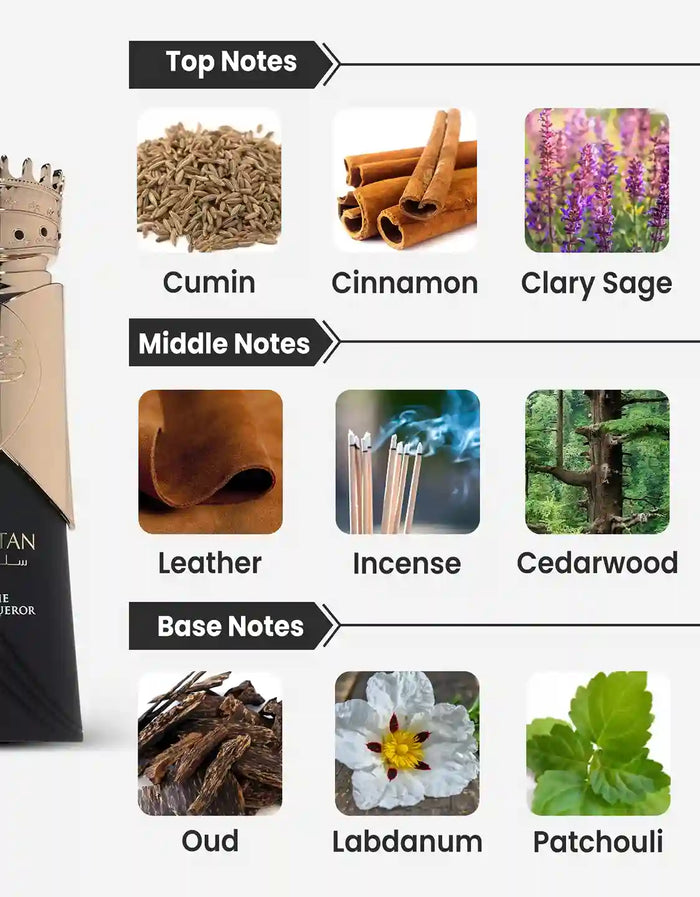 The Sultan The Conqueror 10ML decant captures the full strength of the original 80ML bottle in a portable size. The top notes of cumin, cinnamon, clary sage, and cardamom create a warm and spicy opening that feels rich. The heart blends leather, incense, and cedarwood, giving a smoky and woody aroma that adds depth without being heavy. The base notes of labdanum, oud, patchouli, amber, and guaiac wood finish the fragrance with a warm, balsamic, and animalic touch. With accords of amber, woody, smoky, leather, fresh spicy, balsamic, warm spicy, cinnamon, and oud, this decant is perfect for men who want a strong and bold scent on the go. Ideal for evening events or cooler days, it leaves a confident and memorable impression wherever you wear it.