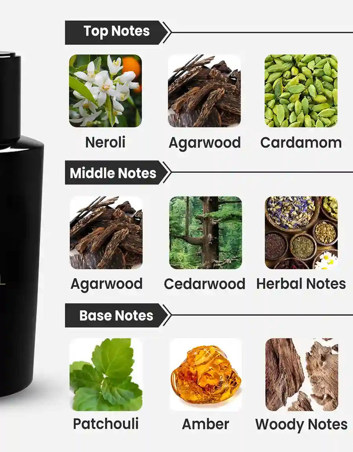 Middle Notes: Agarwood, Cedarwood, Herbal Notes