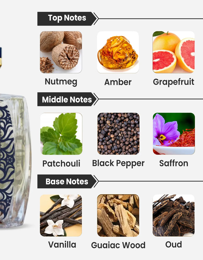 Base Notes: Guaiac Wood, Sandalwood, Patchouli, Labdanum, Vanilla, Benzoin, Oud