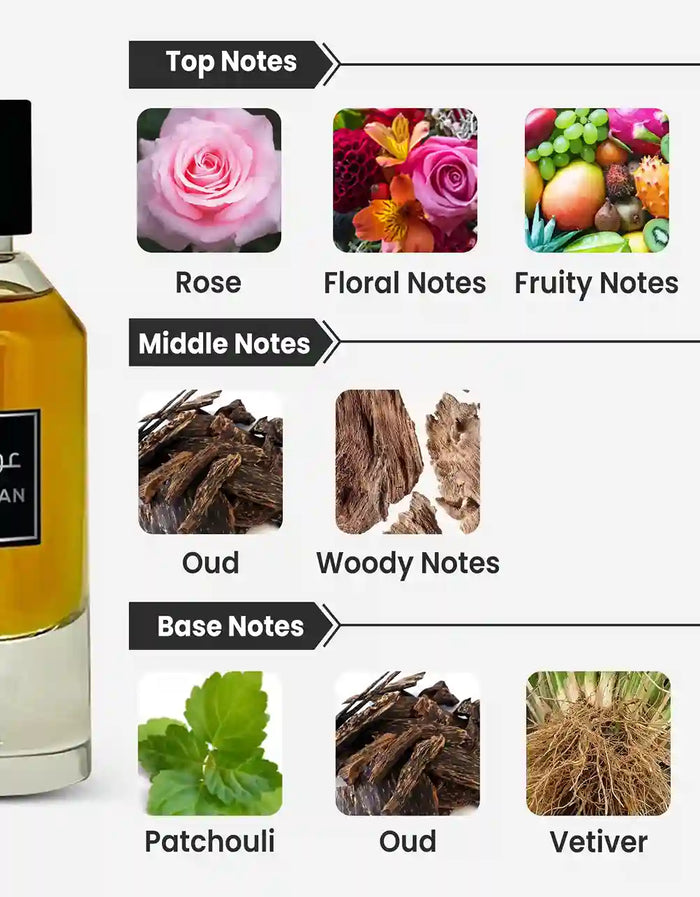 Base Notes: Patchouli, Vetiver, Oud