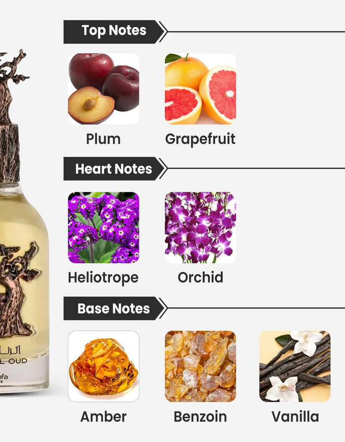 Base Notes: Amber, Benzoin, Vanilla, Labdanum, Tonka Bean, Agarwood (Oud)