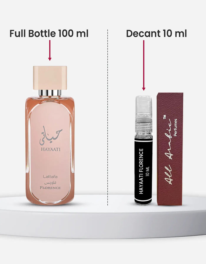 The Lattafa Hayaati Florence EDP 10ML Decant delivers the same citrus and floral fragrance in a convenient size. It opens with fruity notes of lychee, grapefruit, and red currant, offering a lively introduction. The middle combines rose, peach, and cedarwood, creating a smooth floral balance. At the base, amber, musk, and soft florals provide warmth and long-lasting presence. This decant captures the full experience of the 100ML bottle while being portable and easy to carry. It’s ideal for women who wish to test the fragrance or enjoy a compact version for travel. Hayaati Florence highlights citrus, sweet, musky, and floral accords, making it a fragrance that suits daily wear and versatile occasions. The 10ML decant ensures practicality without losing the essence of the perfume.
