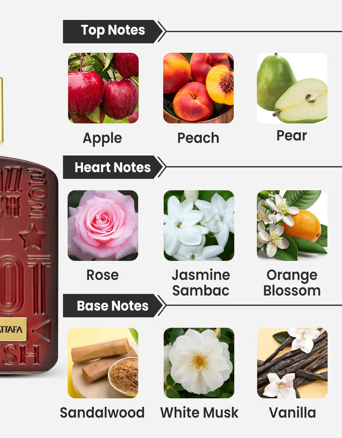 Lattafa Ramz Gold 10ML decant brings the elegance of the 100ML EDP into a convenient and travel-friendly size. It opens with vibrant top notes of apple, peach, pear, sweet orange, and black currant, creating a fruity sweetness that energizes the senses. The heart of the fragrance has jasmine sambac, rose, and orange blossom, offering a powdery floral aroma that adds charm. Finally, the base notes of sandalwood, white musk, vanilla, and patchouli provide warmth, and a lasting musky sweetness, leaving a memorable finish wherever you go. With fruity, floral, sweet, musky, powdery, woody, vanilla, rose, fresh, and citrusy accords, this decant is perfect for women who want a bold and elegant scent on-the-go.