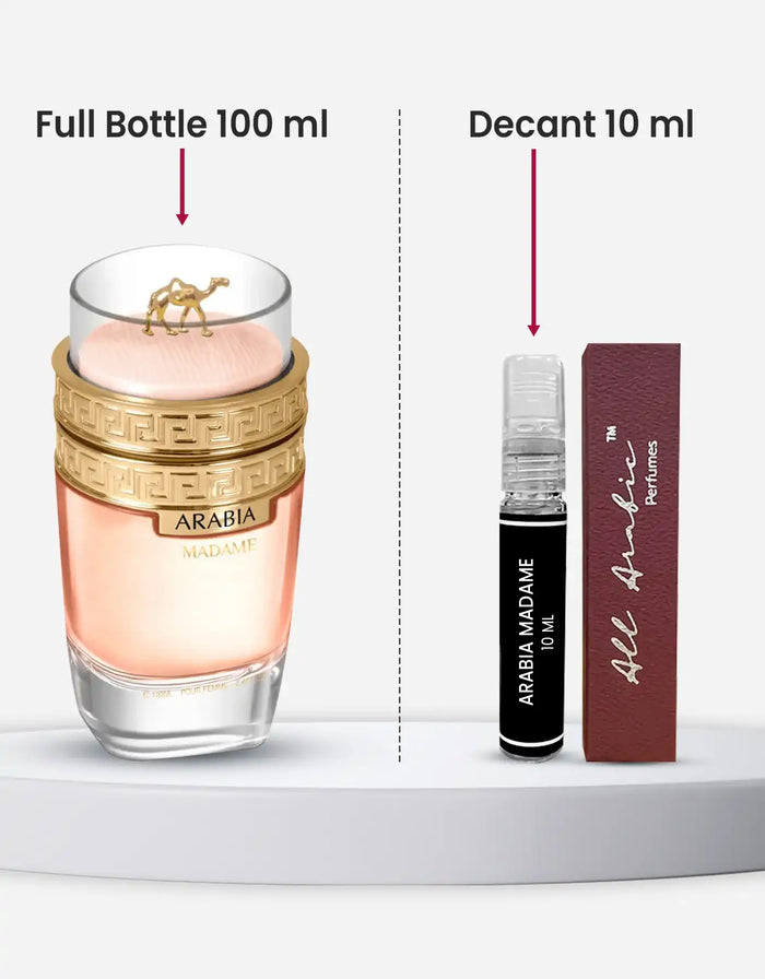 Le Chameau Arabia Madame EDP is now available in a 10ML decant, the perfect size for women who want to experience elegance and sophistication without committing to a full bottle. Arabia Madame blends fresh, floral, and musky accords, creating a graceful and refined fragrance that is both versatile and long-lasting. This handy decant is ideal for slipping into your purse, making it easy to refresh your scent throughout the day or while traveling. Whether you’re attending a special evening event or simply want to feel polished during your daily routine, the Arabia Madame decant lets you enjoy the same luxurious fragrance in a more practical and budget-friendly way. Perfect for testing the scent before buying the full-size 100ML bottle, this 10ML option is a must-have addition to your perfume collection.