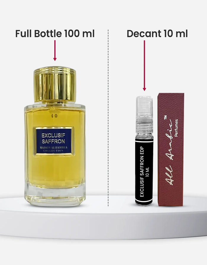 The Maison Alhambra Exclusif Saffron EDP 10ML decant is ideal for experiencing this fragrance in a smaller and more convenient size. It opens with tonka bean and blackcurrant, paired with saffron for a sweet and spiced beginning. As the scent settles, iris and rose bring a floral layer that feels balanced. The base notes of leather, guaiac wood, and vanilla create a finish that lasts without feeling too heavy. This decant is suitable if you want to test the fragrance before committing to a full bottle or need a travel-friendly option. It performs consistently and works well for everyday wear or relaxed evening settings.