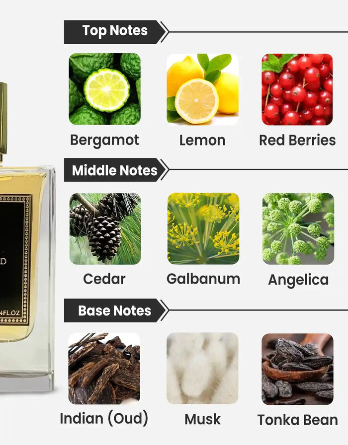 Base Notes: Sandalwood, Indian Oud, Musk, Tonka Bean