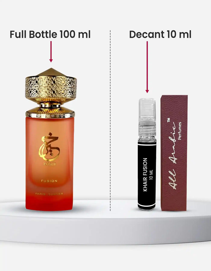 Khair Fusion EDP is now available in a 10ML decant, perfect for carrying this fragrance with you. The top notes of litchi, red apple, black currant, and Italian lemon provide a bright, fresh, and fruity opening. The heart of pansy, jasmine sambac, and Taif rose adds a soft floral and uplifting aroma. At the base, musk, vanilla, cedar, and sandalwood create a warm and woody finish. This decant is ideal for women who want a delightful and memorable scent throughout the day.