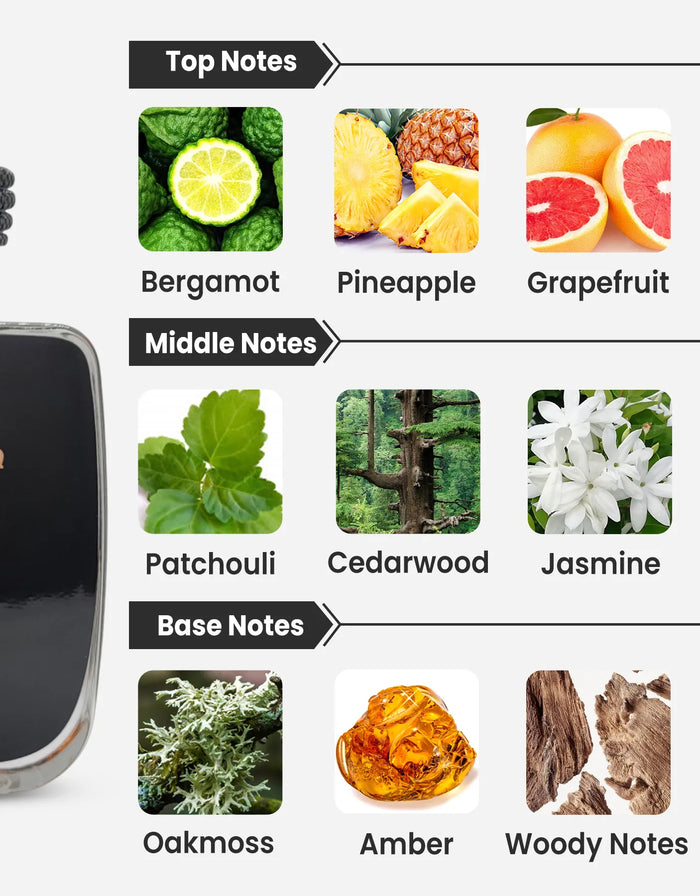 Middle Notes: Patchouli, Cedarwood, Jasmine