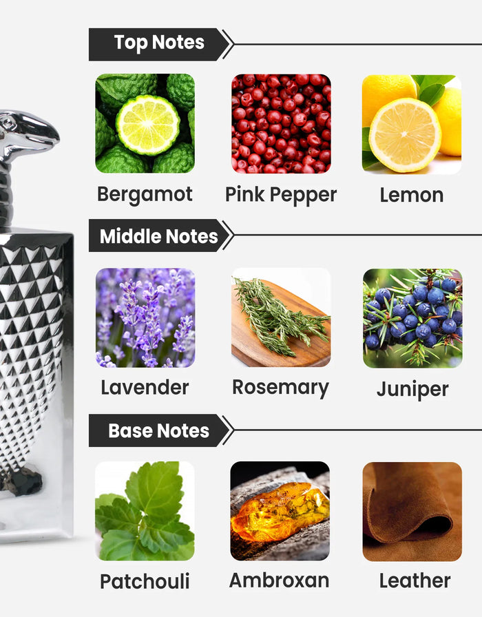 Base Notes: Patchouli, Leather, Ambroxan