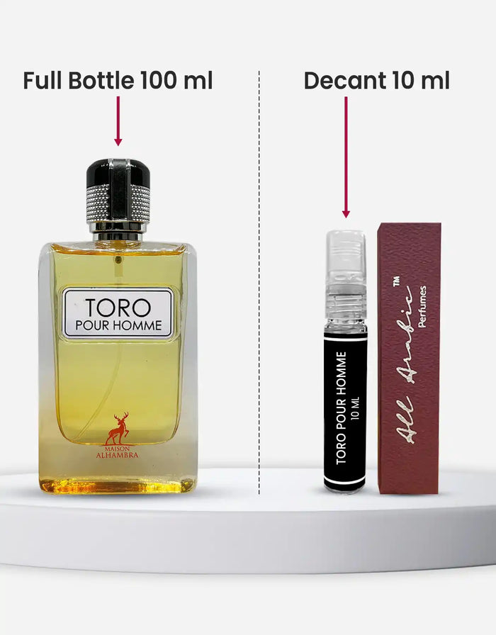 Maison Alhambra Toro Pour Homme is available in a 10ML decant, perfect for men who enjoy citrusy, woody, and spicy fragrances in a travel-friendly size. Top notes of orange and grapefruit deliver a fresh and zesty opening, immediately invigorating the senses. Mid-notes of pepper and cedar provide a spicy and aromatic heart, adding strength and depth to the fragrance. The base of patchouli and vetiver ensures a long-lasting, earthy, and woody finish that enhances masculinity and confidence. This 10ML decant is ideal for carrying in a bag, keeping in your office drawer, or testing the fragrance before purchasing a full-size bottle. Toro Pour Homme suits a variety of occasions, including daily wear, social events, and evening dinners. The blend of freshness, spice, and woody depth makes it a versatile and elegant fragrance for men who want to stand out.