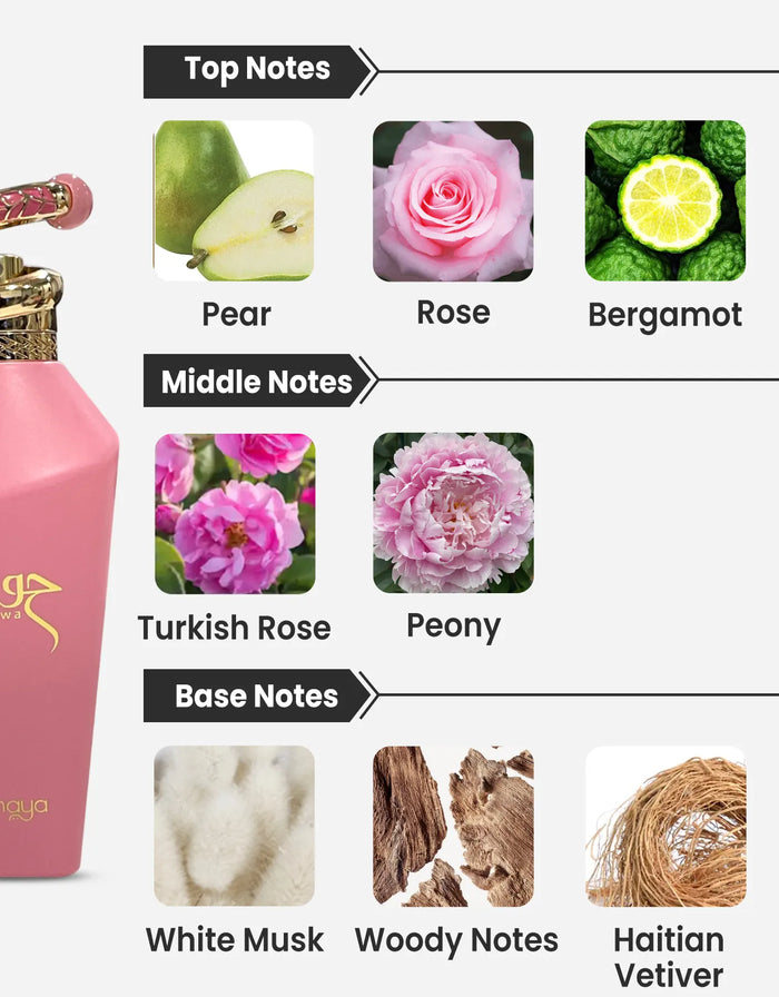 The Zimaya Hawwa Pink 10ML decant is perfect for travel or on-the-go use while capturing the full fragrance experience. The top notes of juicy litchi, soft rose, pear, and bergamot create a lively, refreshing opening. The heart of Turkish rose and peony adds a romantic floral depth that keeps the scent feminine and elegant. The base of white musk, Haitian vetiver, and woody notes provides a long-lasting finish and warmth. Balanced and versatile, this decant allows women to enjoy a playful yet graceful scent anytime. With accords of fresh, fruity, tropical, floral, musky, woody, and aromatic tones, Hawwa Pink leaves a memorable finish without overwhelming the senses. Ideal for daytime wear, summer outings, or casual elegance, this travel-sized decant ensures you always smell fresh and captivating.
